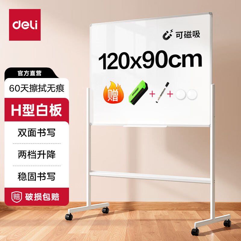 • 得力120*90cm支架白板 白板写字板书写稳固移动升降教学辅导办公会议磁性黑板家庭33725
