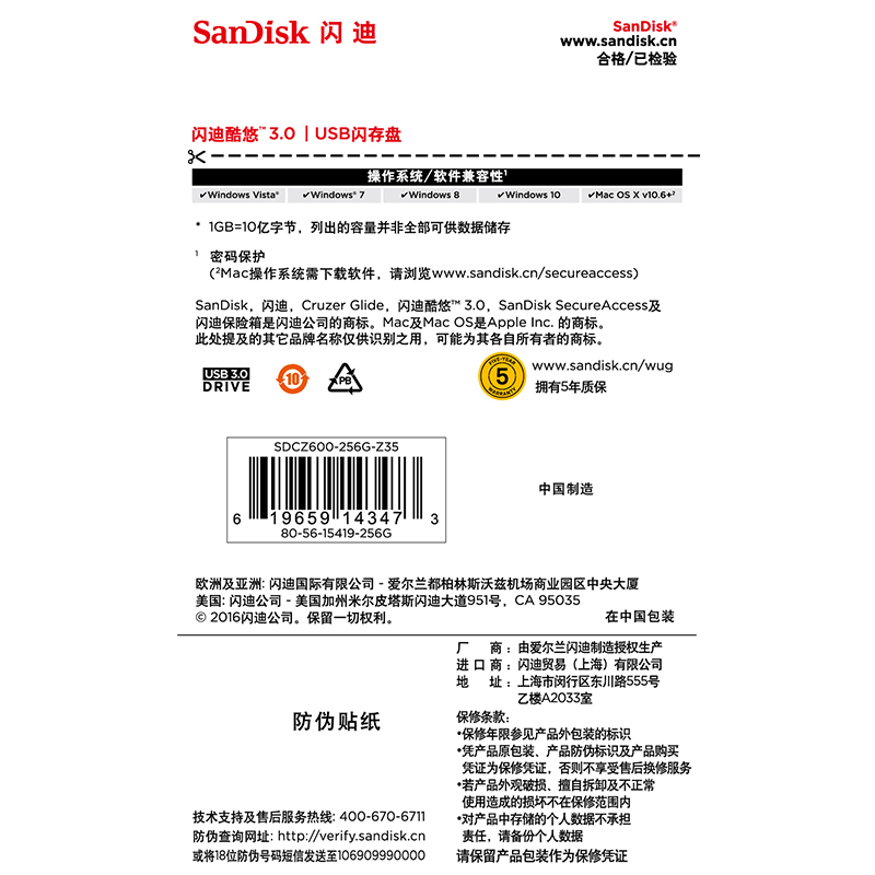 • 闪迪CZ600 256GB USB3.0 U盘 酷悠 黑色 USB3.0入门优选 时尚办公必备