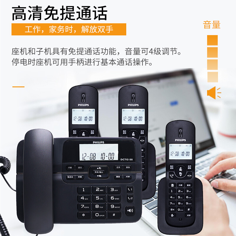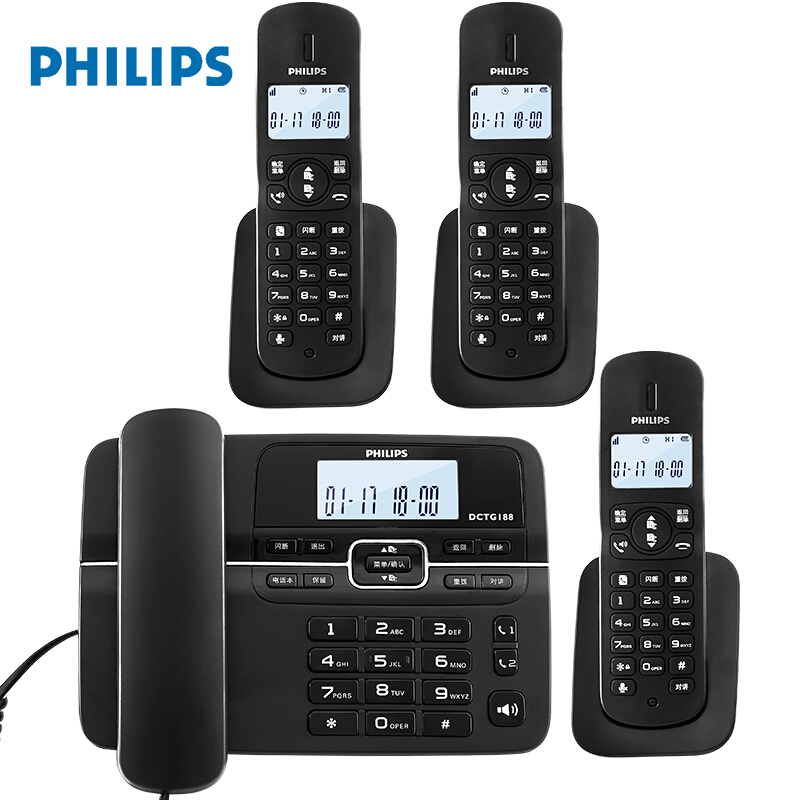 飞利浦DCTG188 HWDCD9889(188)TSD数字无绳电话机办公家用座机电话子母机免提通话/一键拨号/一拖三(黑色)
