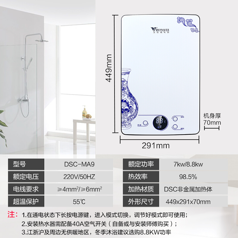 汉诺威(hannover)即热式电热水器电热即热式小型家用淋浴速热恒温0元安装DSC-MA9 青花瓷 8.8KW(需4平方专线或6平方毫米铜芯线路)