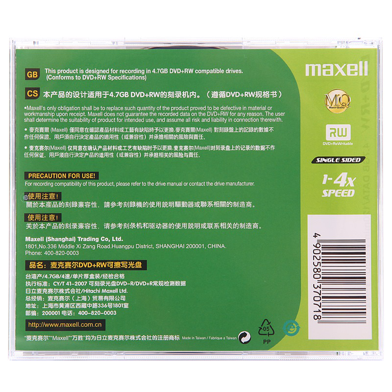 • 麦克赛尔 DVD+RW光盘 刻录光盘 光碟 可擦写空白光盘 4速4.7G台产 1片盒装