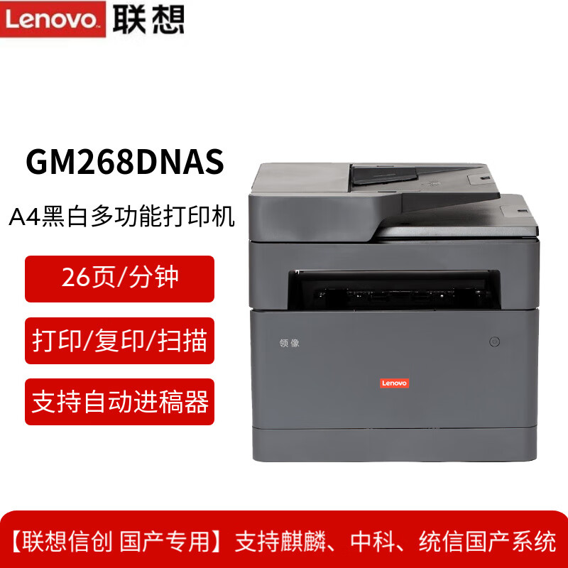 • 联想(Lenovo)GM268DNAS国产打印机 A4黑白多功能办公一体机 打印/复印/扫描/双面/网络/自动输稿器