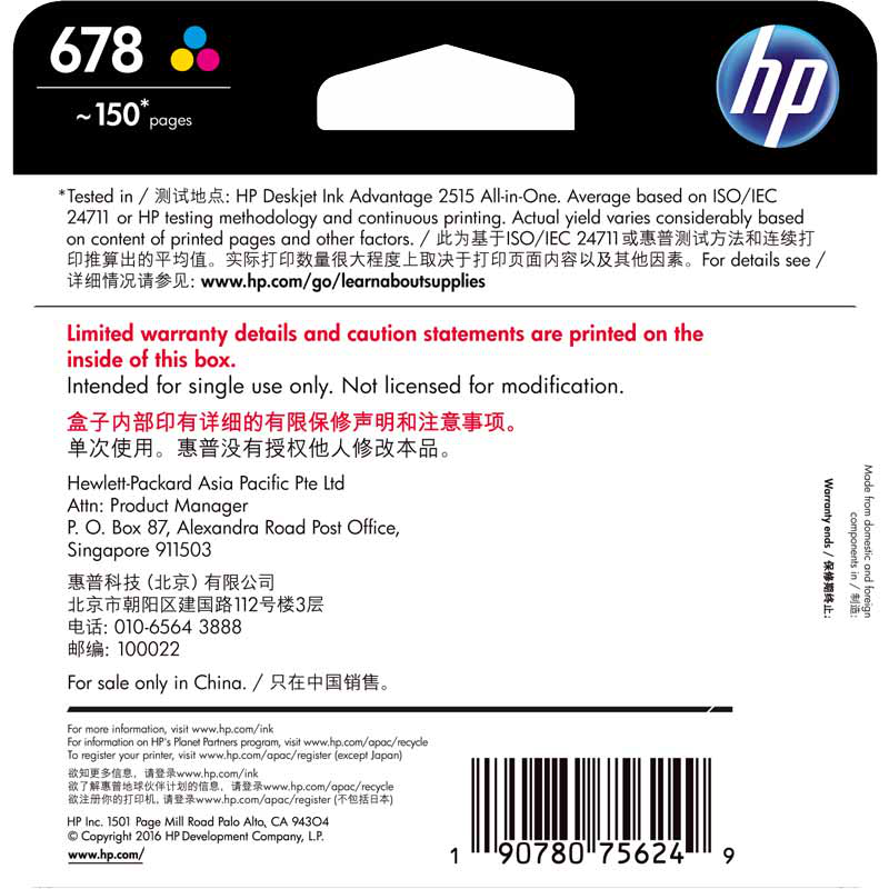- 惠普CZ108AA 678 彩色墨盒(适用HP Deskjet1018/2515/1518/4648/3515/2548/2648/3548/4518)