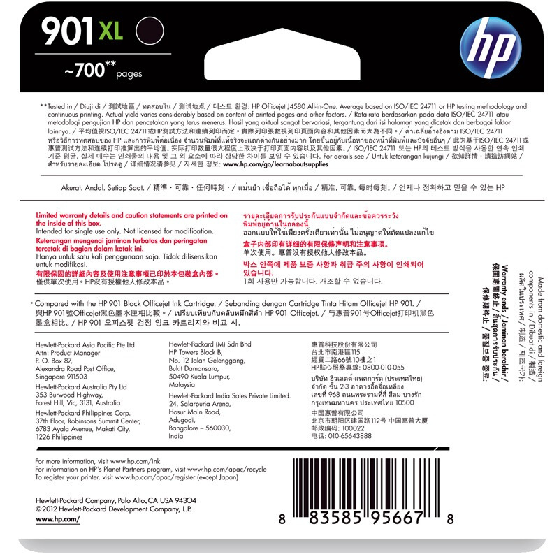 • 惠普CC654AA 901XL 黑色高容墨盒 (适用HP Officejet J4580 J4660 4500)