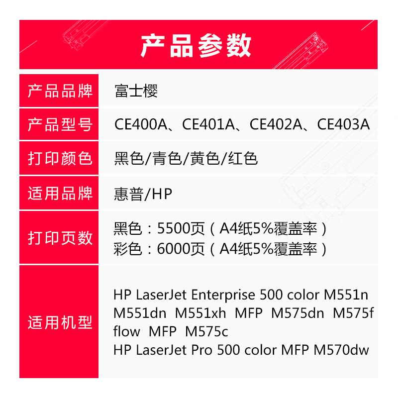 • 富士樱 CE400A-CE403A硒鼓 四色套装507A适用惠普HP M551n/M551dn