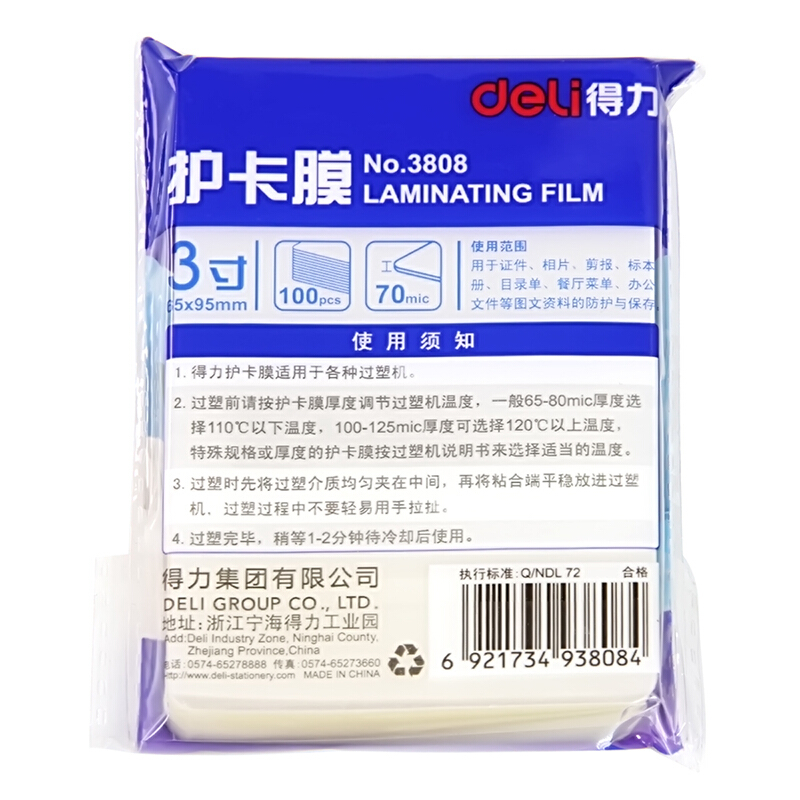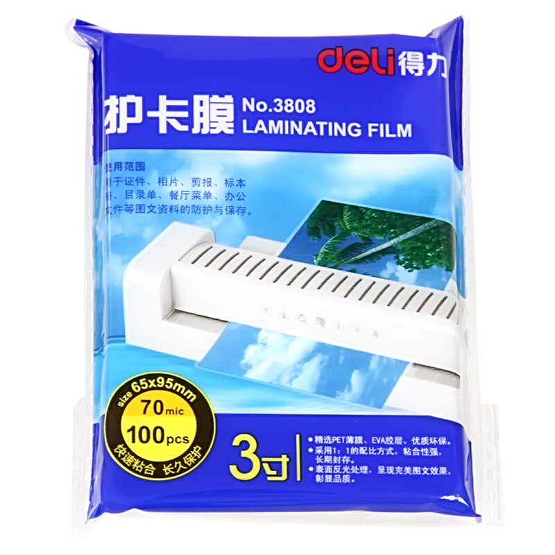 • 得力3808 塑封膜过塑膜照片菜单文件护卡膜塑封机过胶纸热塑袋 【3寸-70mic】100张/包