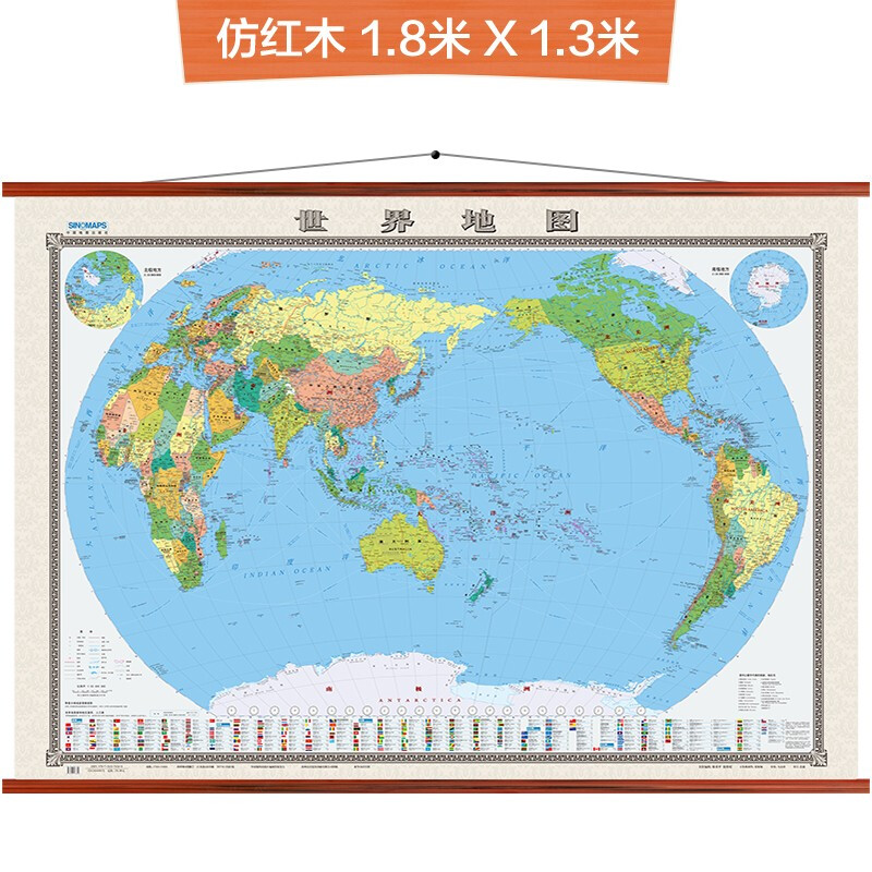 • 世界地图挂图(高档仿红木杆 1.8米*1.3米 全新配色 办公室书房客厅挂图 整张无拼缝)2021年