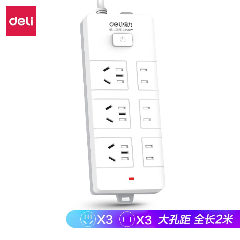 • 得力(deli)18255插座新国标接线板防触电 总控开关插座【3+3插孔 全长2米】