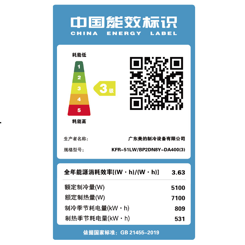 - 美的KFR-51LW/BP2DN8Y-DA400(3) 新能效 大2匹 变频冷暖 空调柜机 三级能效