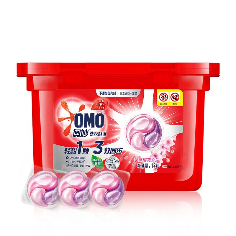 • 奥妙 洗衣凝珠 18颗去渍除菌留香三合一 多色洗衣球 除螨柔顺浓缩洗衣液 樱花香