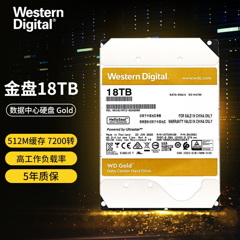 • 西部数据(WD)新金盘企业级NAS网络存储服务器机械硬盘 7200转 18T WD181VRYZ 新金盘