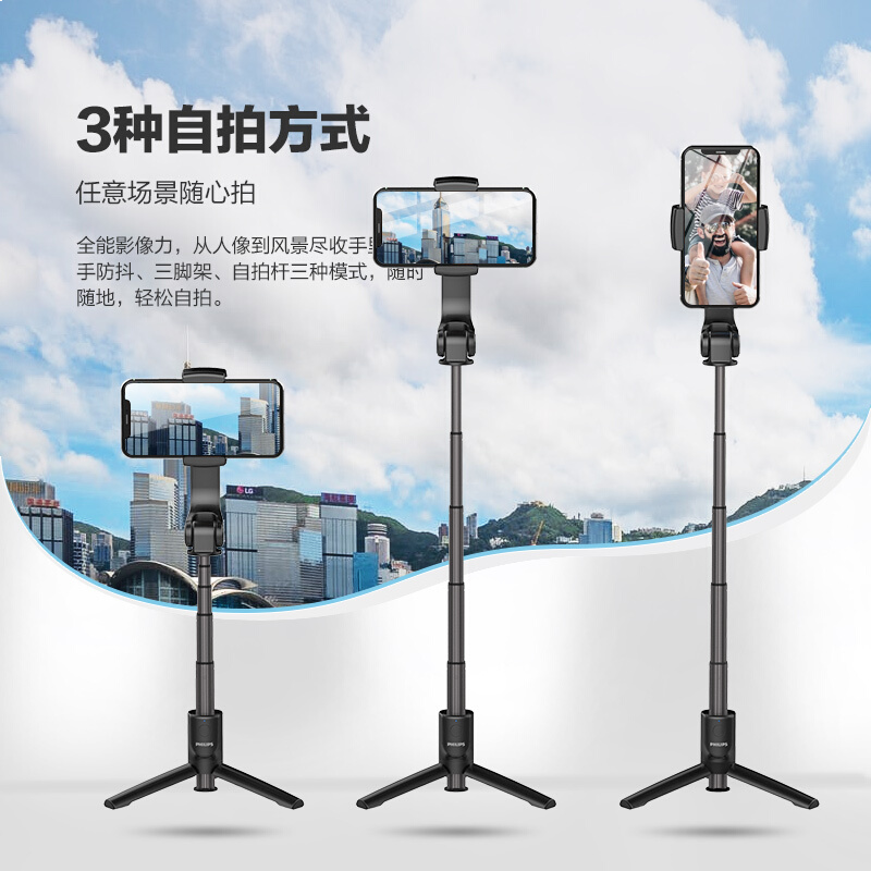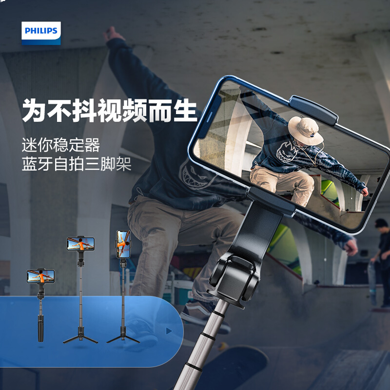 • 飞利浦DLK3619N 手机稳定器 防抖手持云台 手机三脚架自拍杆 无线蓝牙可折叠便携多功能一体直播支架