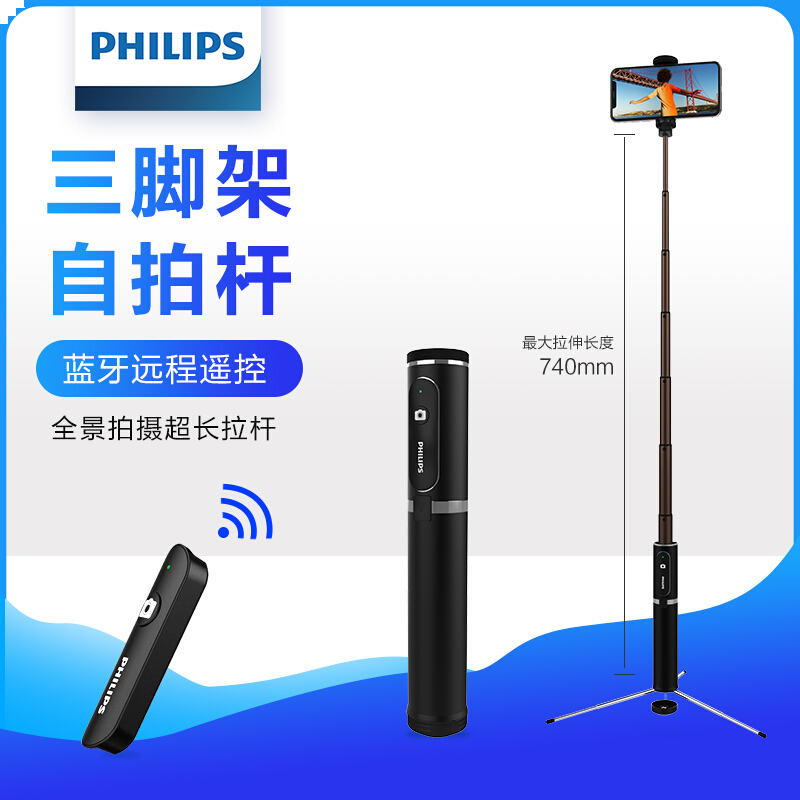• 飞利浦三脚架无线自拍杆 蓝牙遥控 小巧便携 短视频/直播支架360°旋转 安卓/苹果手机通用 DLK3616N