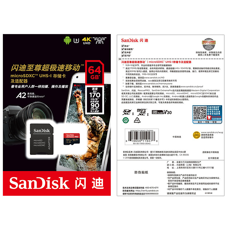 闪迪(SanDisk)64GB TF(MicroSD)存储卡 U3 C10 A2 V30 4K 至尊超极速移动版 读速170MB/s 写速90MB/s