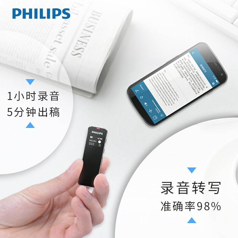 • 飞利浦 (PHILIPS)VTR5102 16G 会议录音笔 语音转文本智能APP 声纹感应 录写同 VTR5102【16GB/转文本/AI智能】
