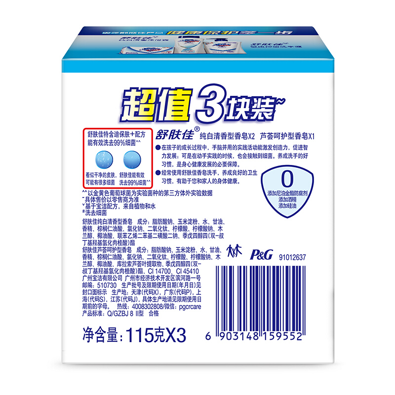 舒肤佳香皂混合三块促销装115gX3(纯白清香+柠檬清新+芦荟呵护)(温和洁净 新老装随机发货)