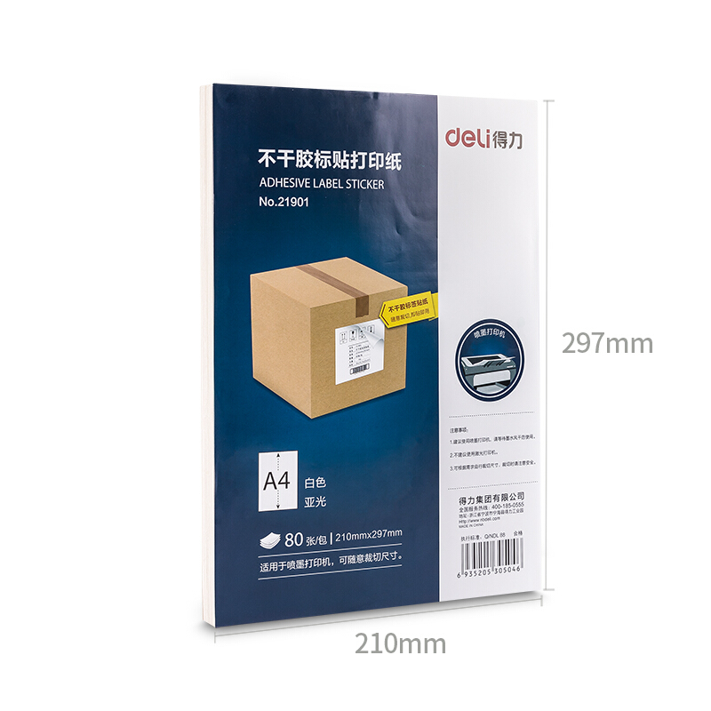 得力21901 A4/80张不干胶标贴打印纸 带背胶亚面铜版标签纸 自切割