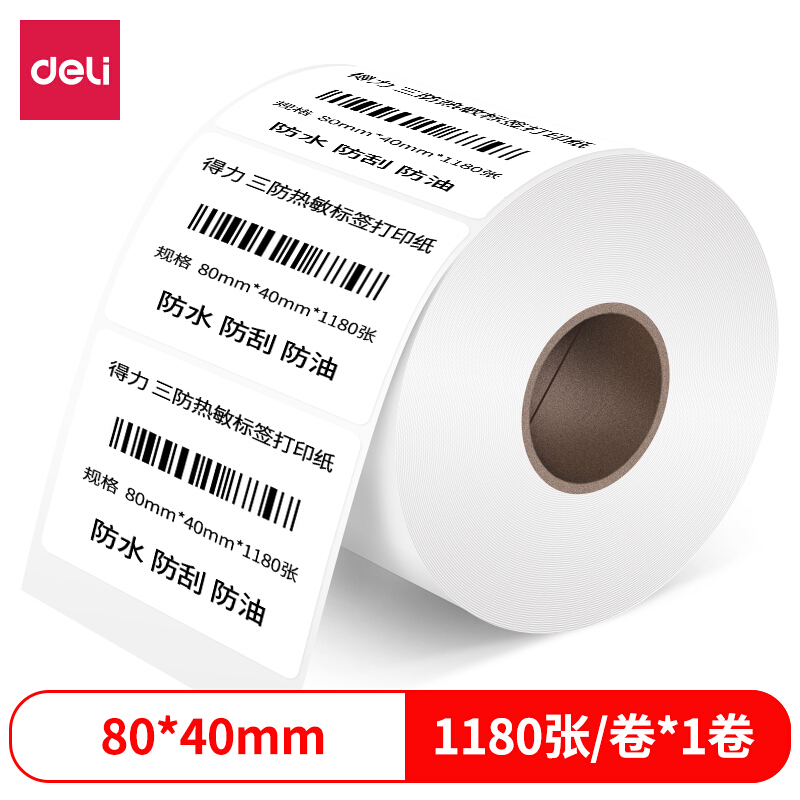 得力(deli)80*40mm三防热敏标签打印纸电子面单不干胶打印纸1180张*1卷12014